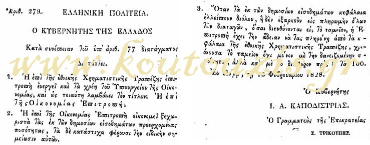 Ευρισκόμενος στον Πόρο ο Κυβερνήτης υπέγραψε το διάταγμα 177/1828 με το οποίο ανέθεσε στην Εθνική Χρηματιστική Τράπεζα , μετέπειτα Εθνική Τράπεζα, αρμοδιότητες Υπουργείου Οικονομικών.